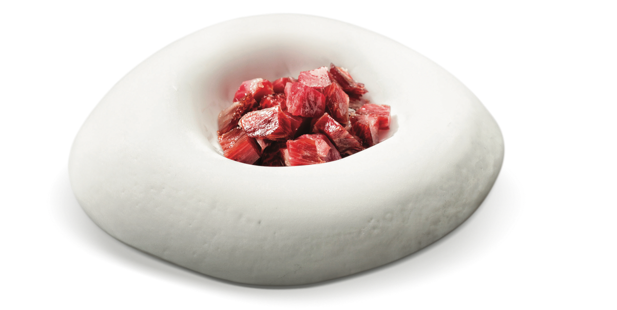 (Above, some variations on the theme of Ferran Adrià’s Joselito ham: here above, for educational purposes, cubed ham for cooking, one of the traditional cuts indicated by the famous thrice-starred chef together with the classic slice or julienne, suggesting the best use in the dish for each one)