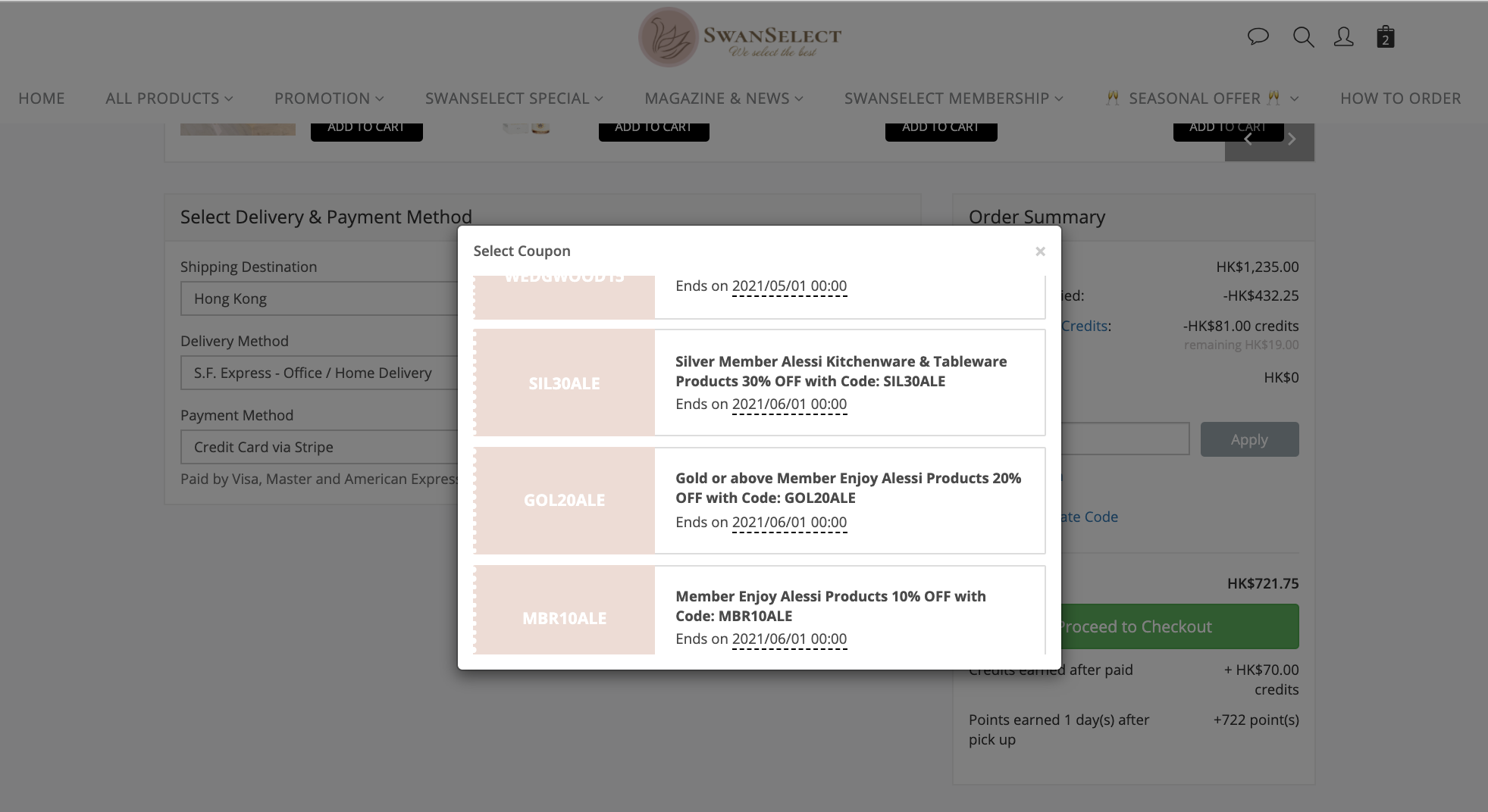 Login to your account and go to the COUPON TAB as demonstrated below. You will find the coupon codes for your specific membership Tier