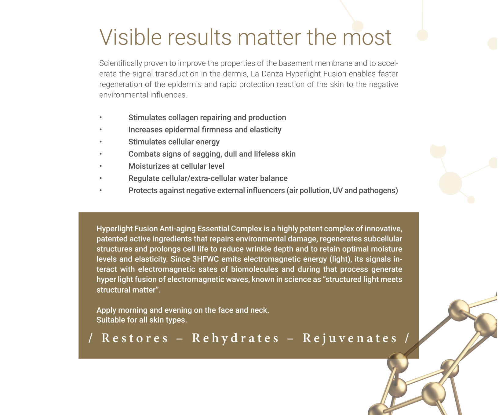 A line of innovative products and treatments with proven results, providing a new era of anti-aging treatments. The patented, unique derivative of the C60 molecule restores, rehydrates and rejuvenates the skin. The Anti-aging Essential Complex with clinically proven results is a highly effective face elixir that moisturizes at a cellular level, protects skin against external sources of damage, regenerates cellular structures, reduces redness and hyperpigmentation, reduces wrinkle depth and improves skin’s firmness and elasticity.