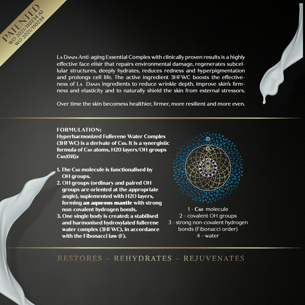 Its key active ingredient, Fullerene water complex (3HFWC), boosts the effectiveness of La Danza ingredients to reduce wrinkle depth, improve skin’s firmness and elasticity and naturally shield the skin from external stressors. The nano-harmonized material inhibits collagen degradation and recovers the epidermal barrier function of the skin. Fullerene water complex locks in moisturization in the skin, where moisturisation acts as the most important anti-aging facet to skincare.