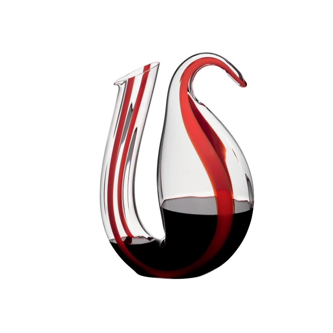 The elegant and imposing Ayam rooster-inspired decanter embraces form and function. Its double decanting function allows young wines to open up and unleash their full potential, creating a similar effect to aging the wine. Highest level of craftsmanship is required to blow a decanter of this size and functional complexity. The spiral- shaped groves are impressed in the glass using a special technique that is only mastered by a few glass blowers today. Available in black and red, this decanter is definitely one of the most aesthetics decanters to place at home.