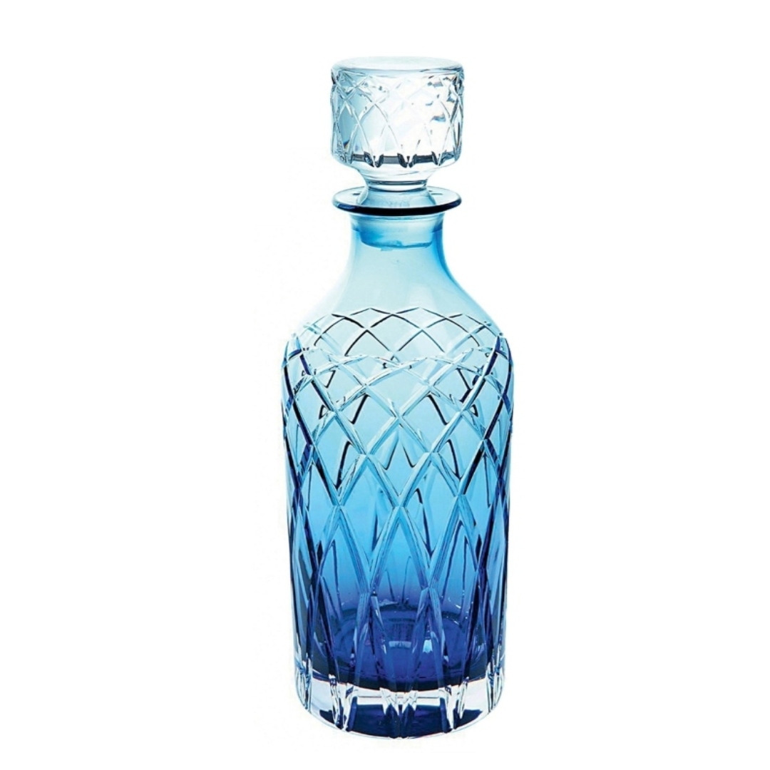 Accented with a solid clear base and stopper, the Dartington Harris Ink Blue Spirit Decanter has a flowering neck line that provides a good grip when pouring. Mouth blown in England and elegantly decorated with sweeping cuts, this one- of-a-kind decanter is well suited for all men and women of taste.
