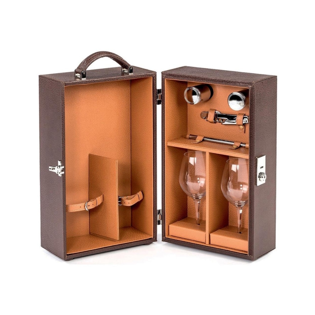 The Cedes Milano Travelling Wine box is made from quality wood finished with brown, tex- tured pigskin and complete with a palladium-treated brass lock and hinges. All the materials are ethically sourced and finished by Italian artisans.