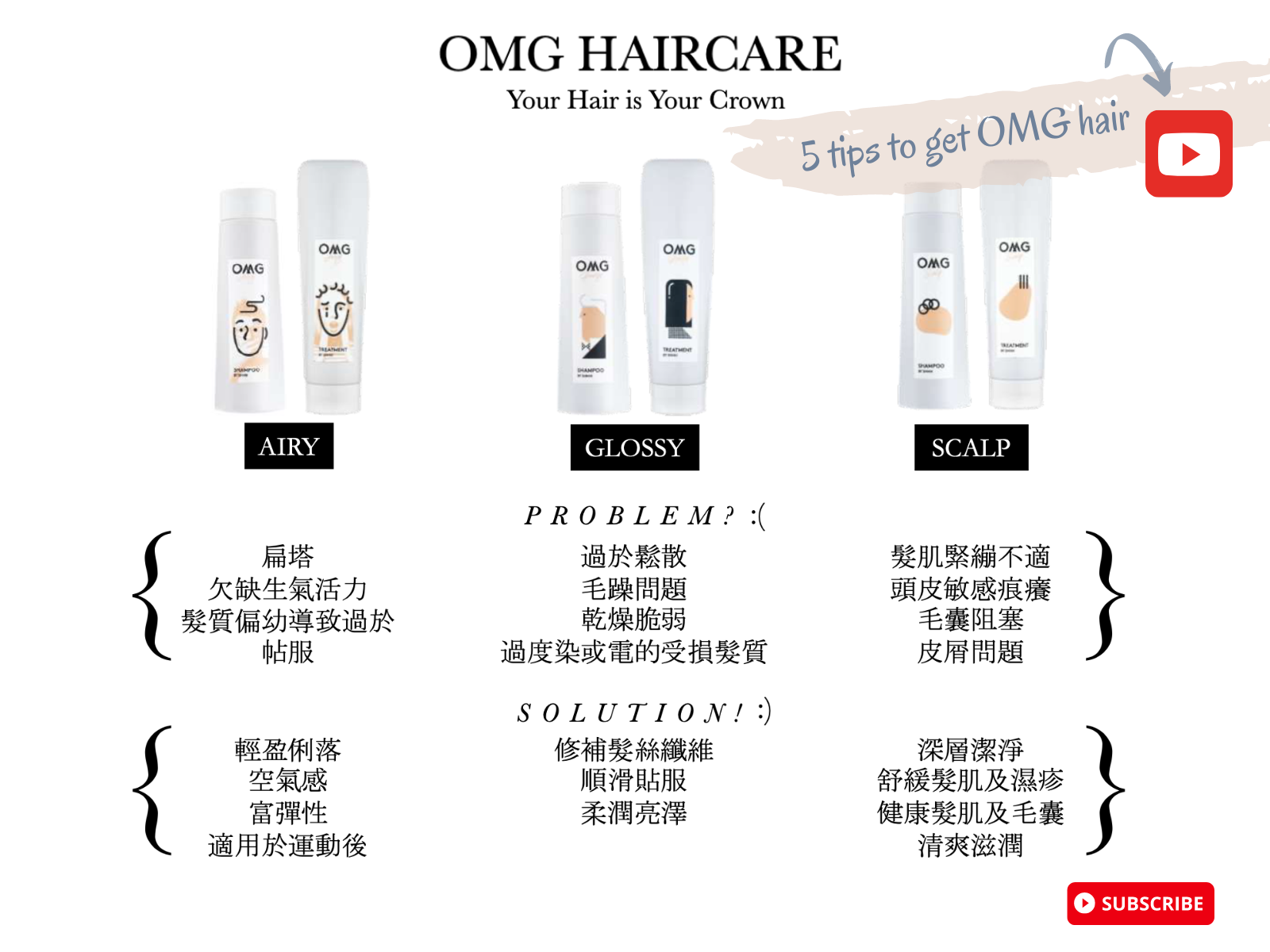 精美的美容護膚品,新穎的健身裝置和每季的時尚服飾市場上應有盡有,但有效針對 頭髮健康保養問題的美髮產品卻屬罕有。若有人說煩惱絲的問題無法解決,相信他還 未試過 OMG 系列。