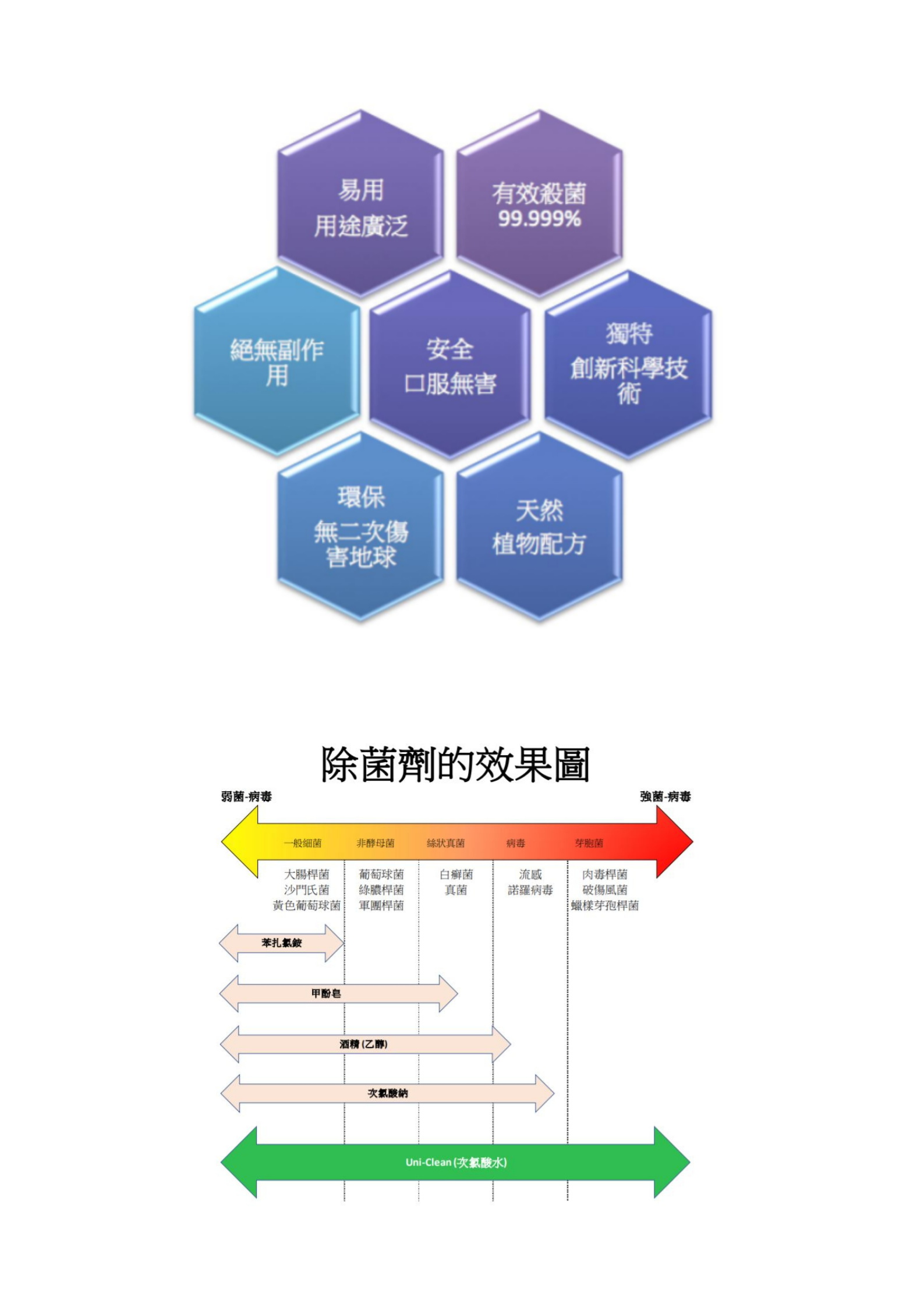 Globall Pharma UNI-CLEAN 多功能滅菌劑,能有效地淨化空氣、防止細菌及病毒散播、保障我們 的健康。測試證實應用於周圍的物件表面,STC 及廣微測檢測結果短時間內有效 殺滅 99.999%病毒及細菌,包括大腸桿菌、白色念珠菌、鼠傷寒沙門氏菌及金黃 葡萄球菌,是一種安全、無害、無毒的產品!